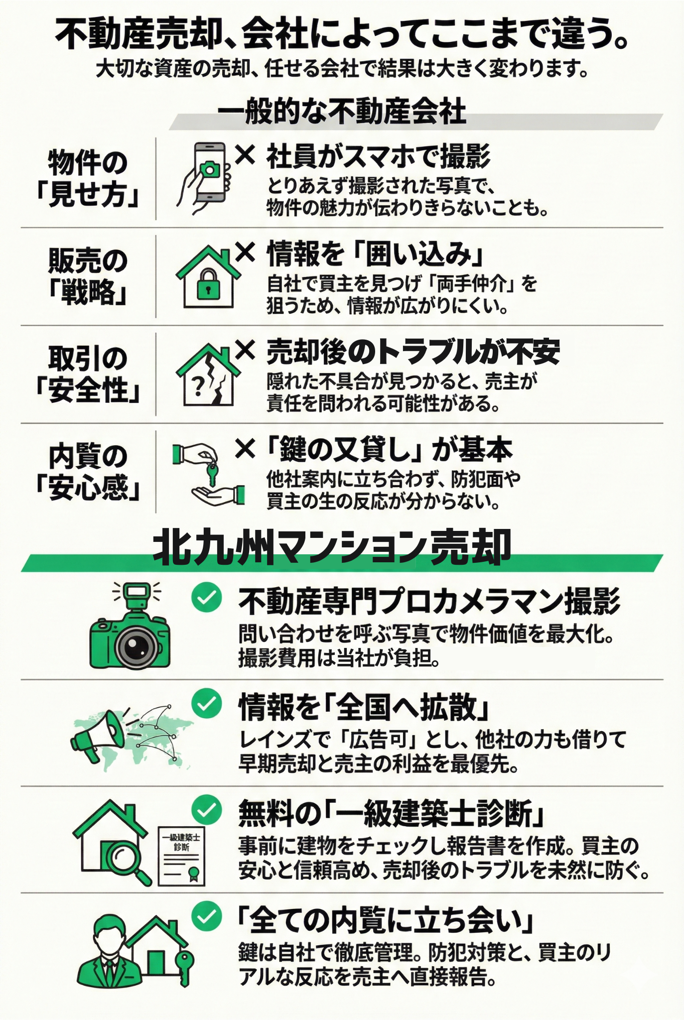 申し訳ございませんが、「北九州マンション売却」サービスでは一般媒介でのご依頼はお受けしておりません。マンション売却の場合は、専任媒介のみでお願いしております。